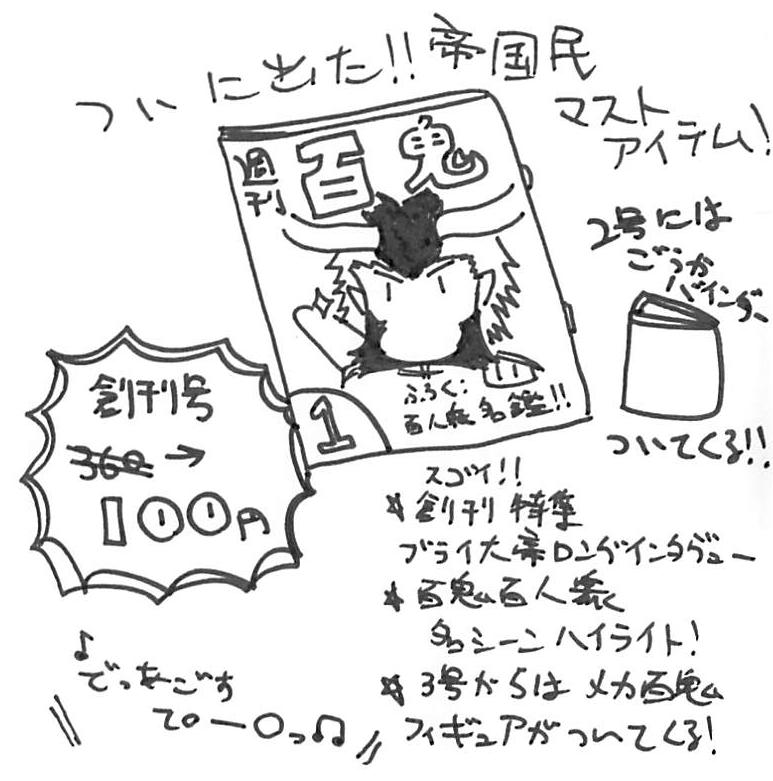 2ちゃんねる某スレッドに昔出てきたネタ。果たして最終号まで買い続ける猛者は出るのか…?!まあ出てない百鬼百人衆もたくさんいるとはいえ「百人衆」なので、100号は固いと思います。